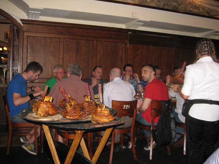 When the waitress shoved aside dishes of potatoes, sauerkraut and red cabbage to make way for the wooden trencher of massive pork knuckle at my end of the table, I thought she might bring two for the twelve of us.